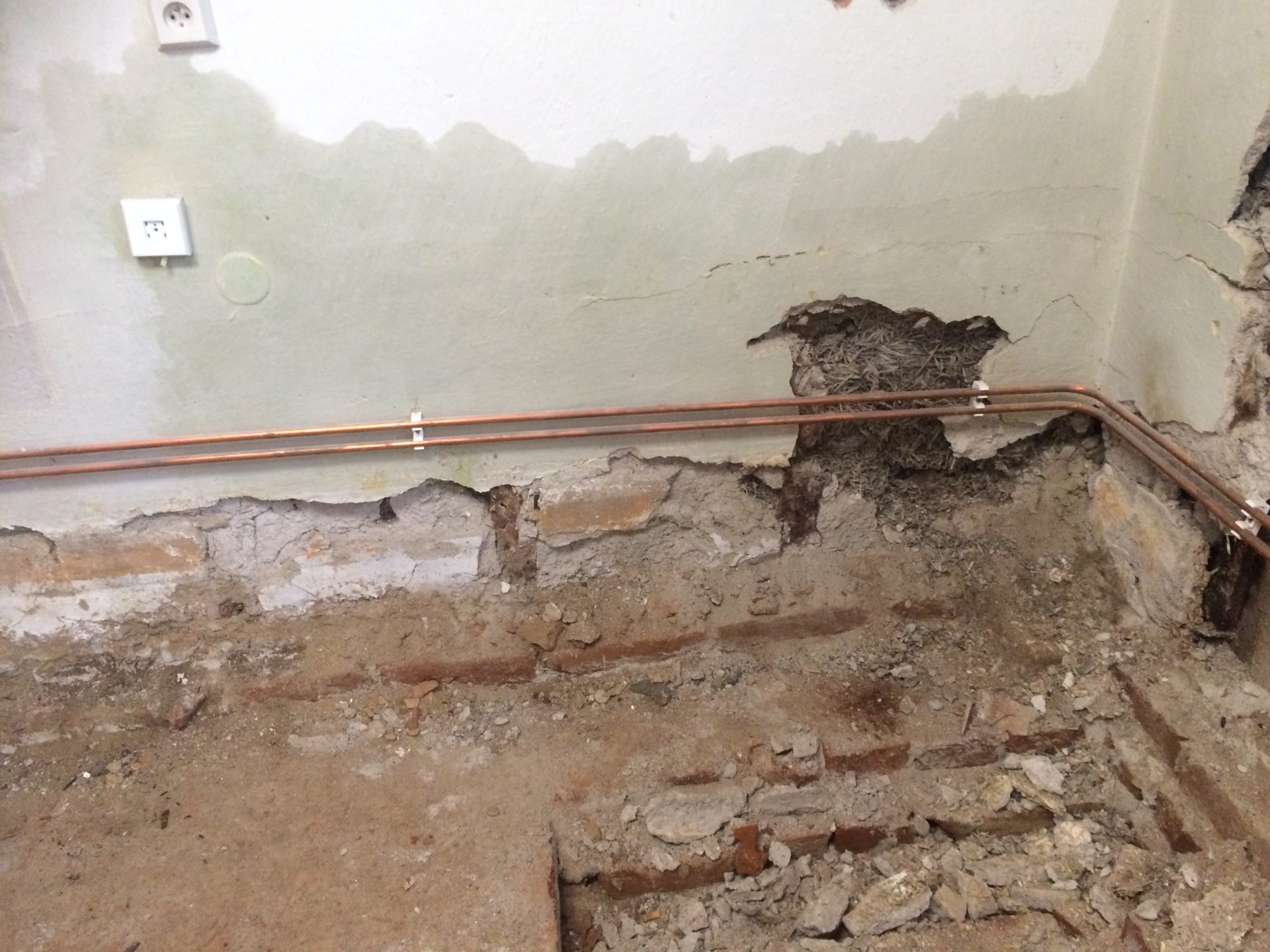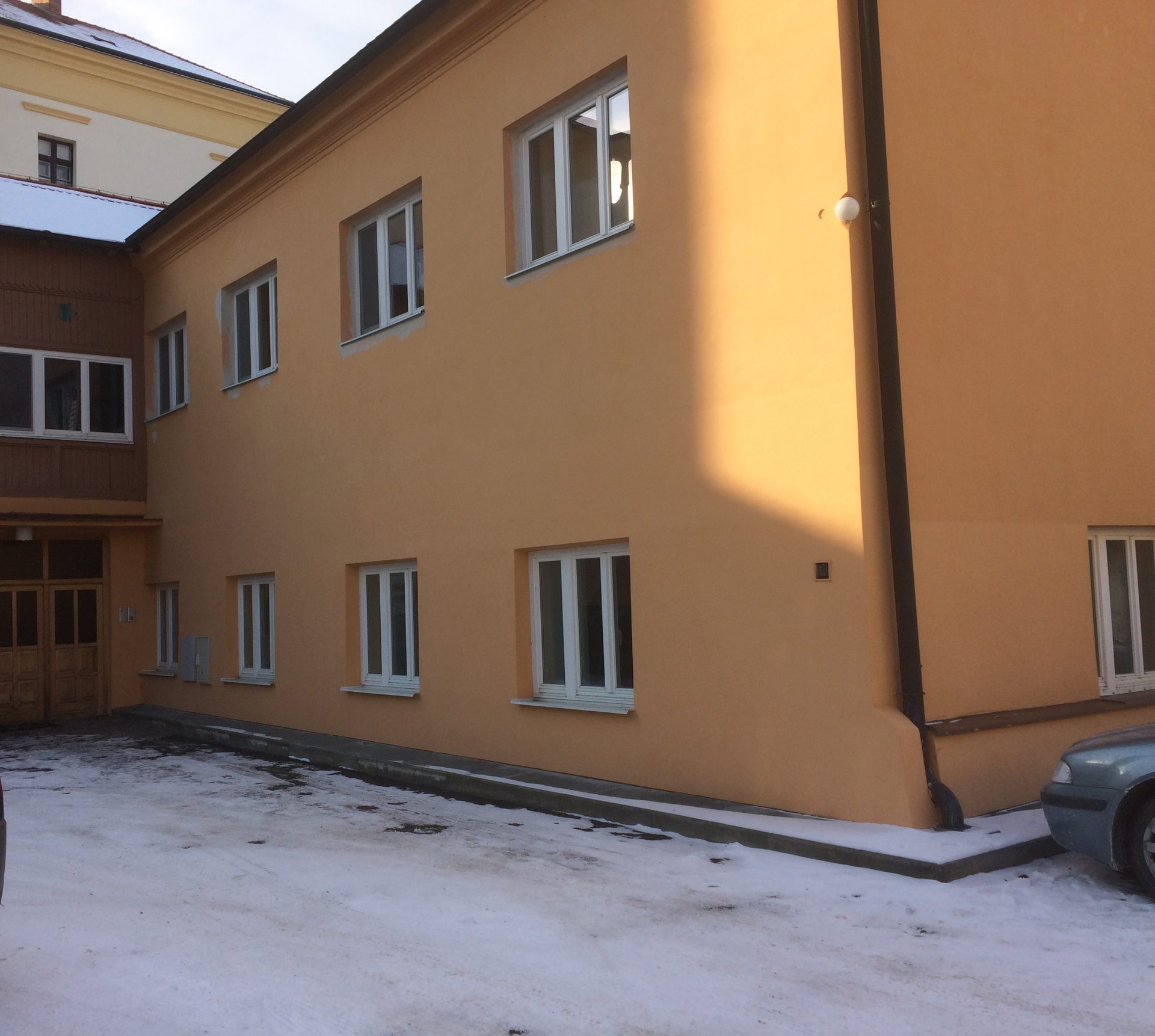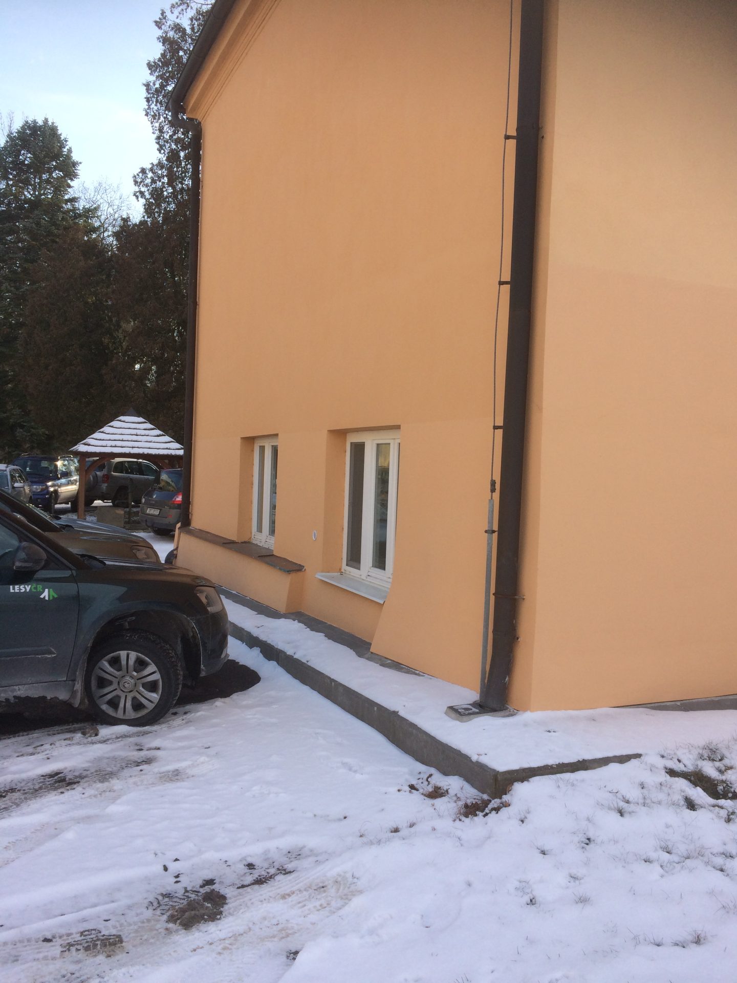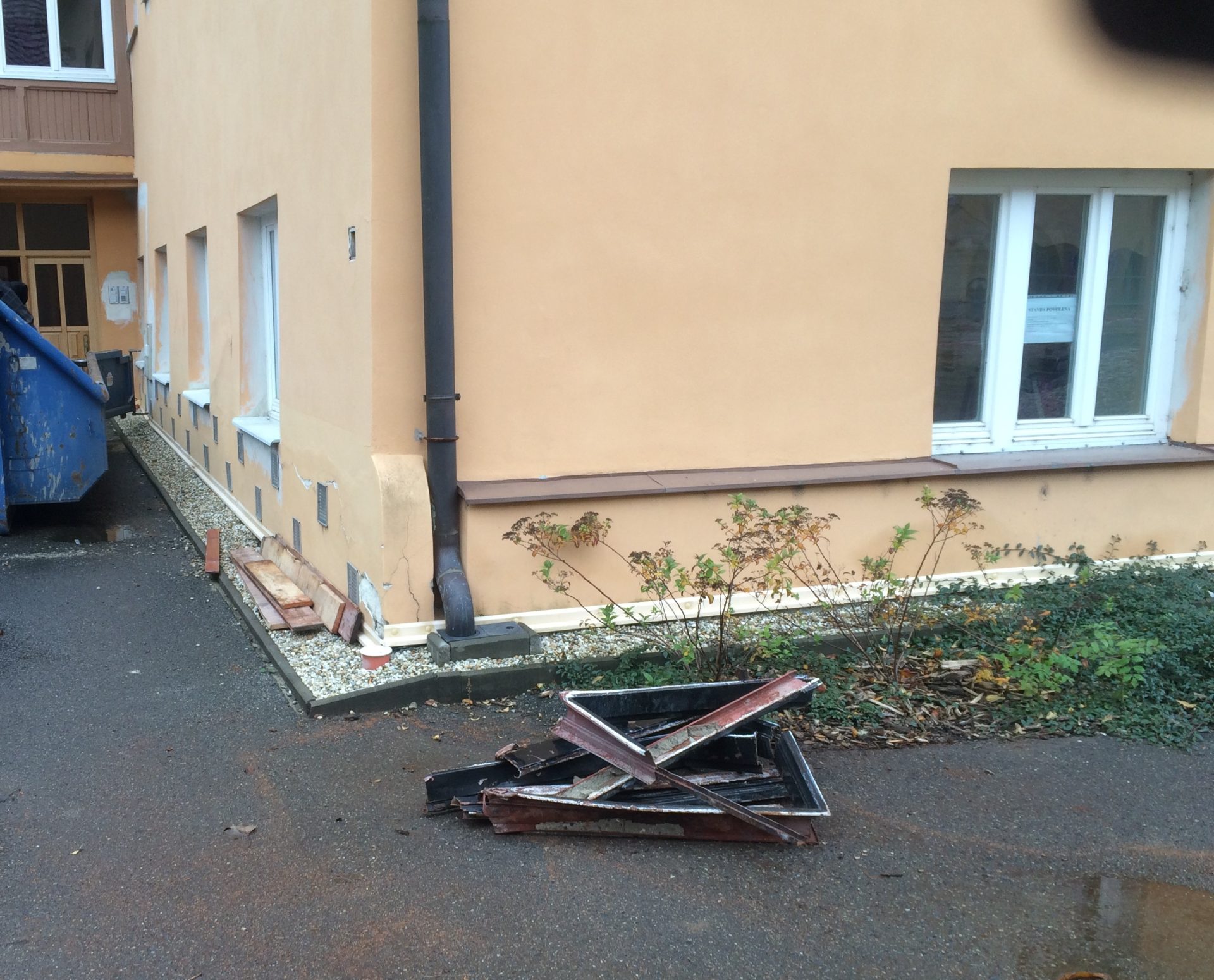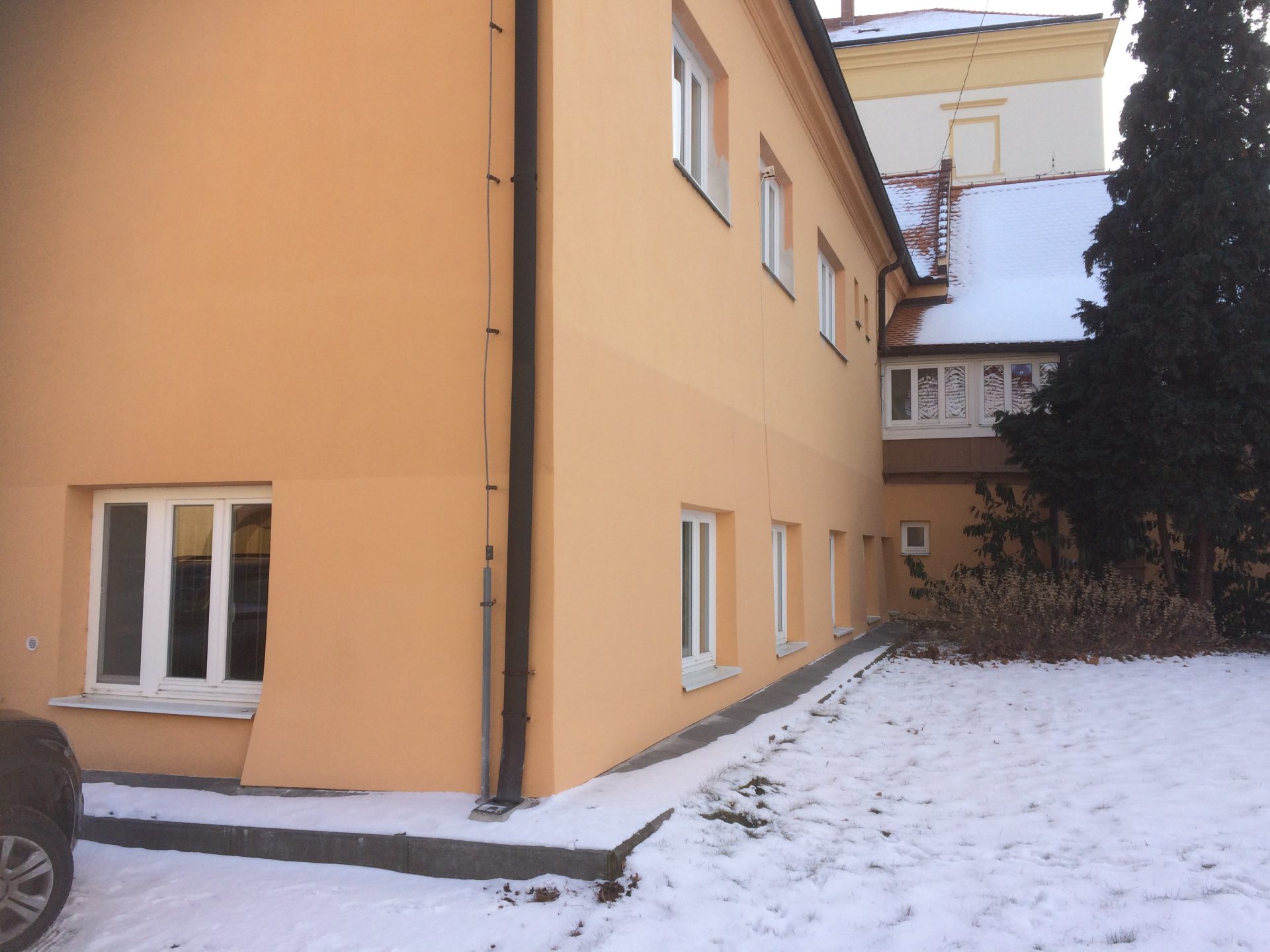 Před časem zde proběhlo neuvážené opatření proti zemní vlhkosti v části budovy, kde je úroveň podlahy pod terénem. Vnější výkopy byly opatřeny pouze nopovou folií, drenáží a zásypem z kameniva. Nevhodným spádováním přilehlých zpevněných ploch parkoviště tak docházelo přes zásyp kameniva k zatékání povrchové vody přímo do obvodových konstrukcí. Vlhkost na vnitřním líci konstrukcí tak z původní výšky cca 0,5m dosáhla výšky až 2,5m.